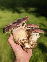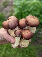 Wine Caps, Garden Giants, Stropharia rugosoannulata, a mushroom of many names! These hefty guys grow easily in outdoor beds made of woody materials. A devourer of wood, these edible mushrooms pop out in the Spring and Fall and sometimes in the Summer when conditions are right. Try them inter-cropped with vegetables, plants and herbs in your garden!